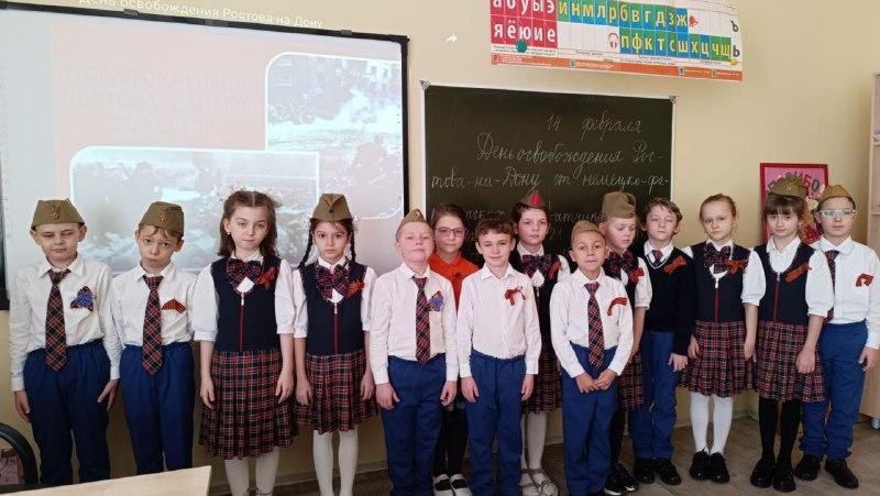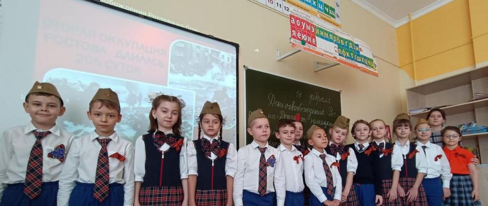 В рамках месячника военно-патриотического воспитания 14 февраля во втором классе прошёл классный час, посвящённый Дню освобождения Ростова-на-Дону от немецко-фашистских захватчиков. Ребята узнали, что Донскую столицу оккупировали дважды — в ноябре 1941 года и летом 1942 года. Поговорили о роли этих боев для Великой Победы над фашизмом. Вспомнили значение георгиевской ленты — огонь и дым, вечная память павшим. Ребята почувствовали гордость за свою Малую Родину.