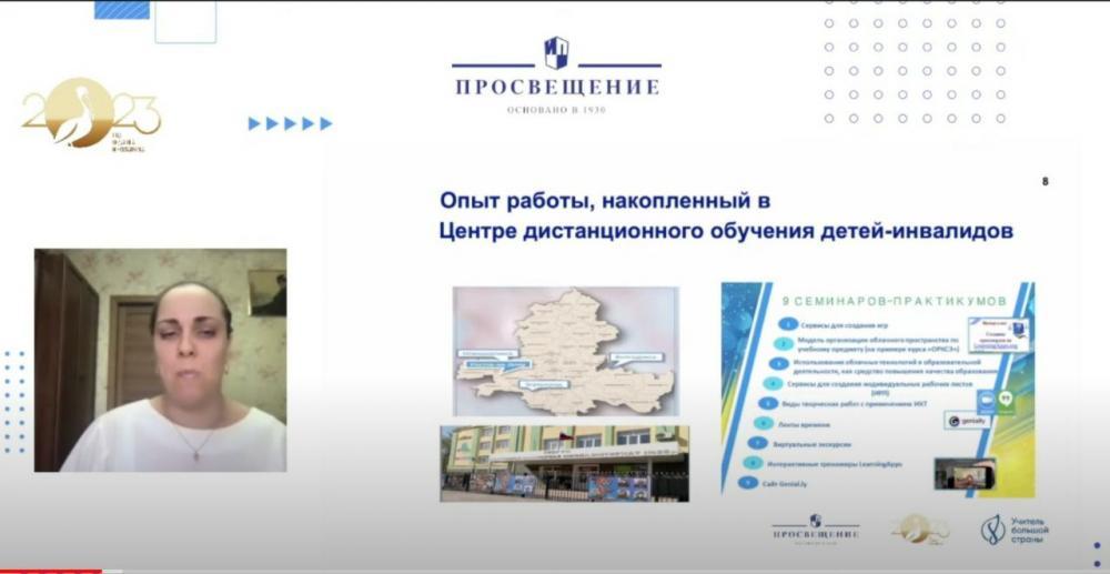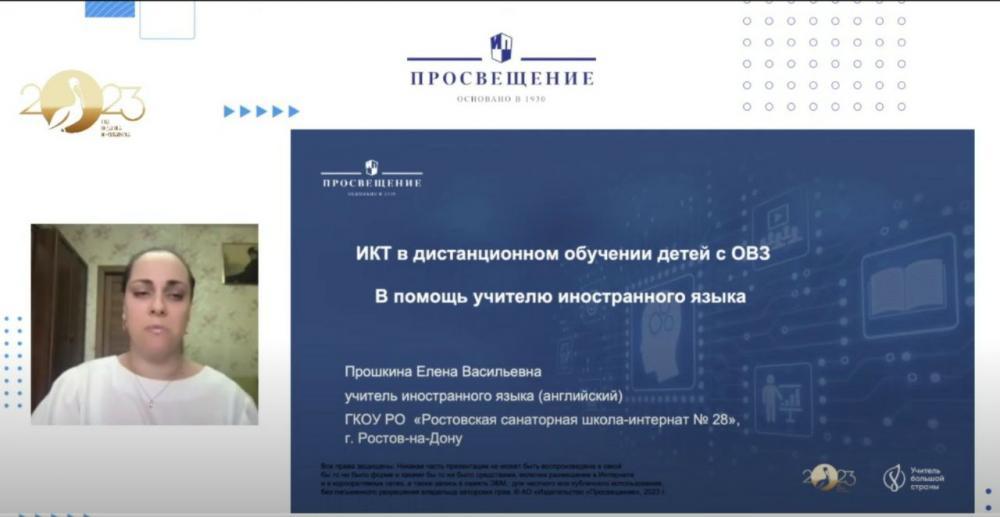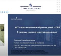 Методический вебинар для педагогов всей нашей большой страны провела учитель английского языка Прошкина Елена Васильевна в рамках Всероссийского проекта издательства «Просвещение» - Методический ПроАктив — единство знаний и решений. Она поделилась опытом работы школы с учащимися с ограниченными возможностями здоровья, рассмотрела дидактические условия обучения английскому языку детей с диагнозом - сахарный диабет и сопутствующим нарушением зрения. Коллеги получили практические советы и методические рекомендации по применению ИКТ в рамках дистанционного обучения.