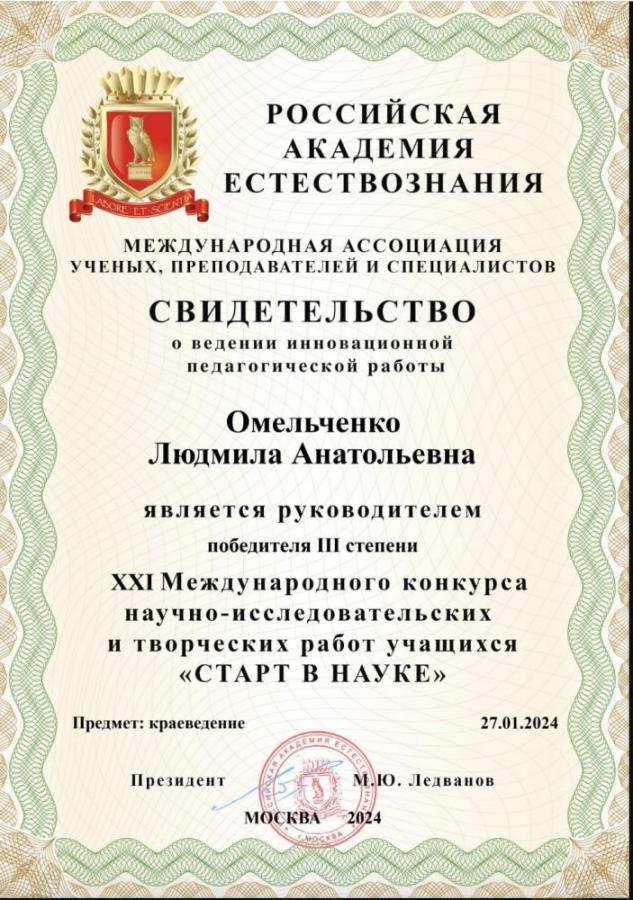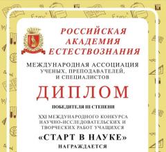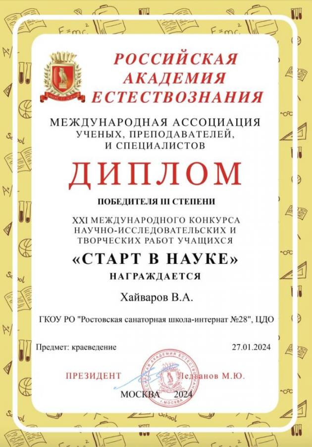 Хайваров Владислав, ученик 11 класса ГКОУ РО "Ростовская санаторная школа-интернат 28" стал победителем XXI Международного конкурса научно-исследовательских и творческих работ учащихся «Старт в науке», организованного Российской Академией Естесствознания.